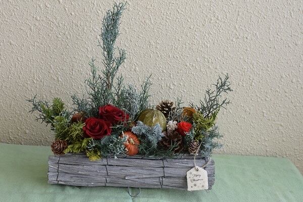 プリザーブドフラワーのクリスマスアレンジです。フラワーアレンジメントでパラレルのデザインです。パラレルとは植物が自然に太陽に向かって生えている様を表現したナチュラルなデザインです。ヒムロスギにブルーアイス、赤い薔薇とライム、ソラナムのフルーツポプリそして松ぼっくりがクリスマスの雰囲気を盛り上げています。